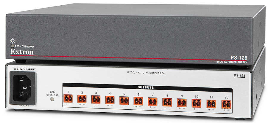 PS 128 General Power output 12 VDC, regulated; 8 A maximum; 96 watts, total for all 12 outputs NOTE Maximum output current is rated at an ambient temperature of 40 °C. Power input 100 VAC to 230 VAC, 50-60 Hz No load 6.6 watts at 115 VAC
